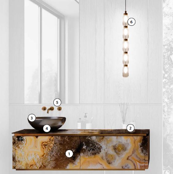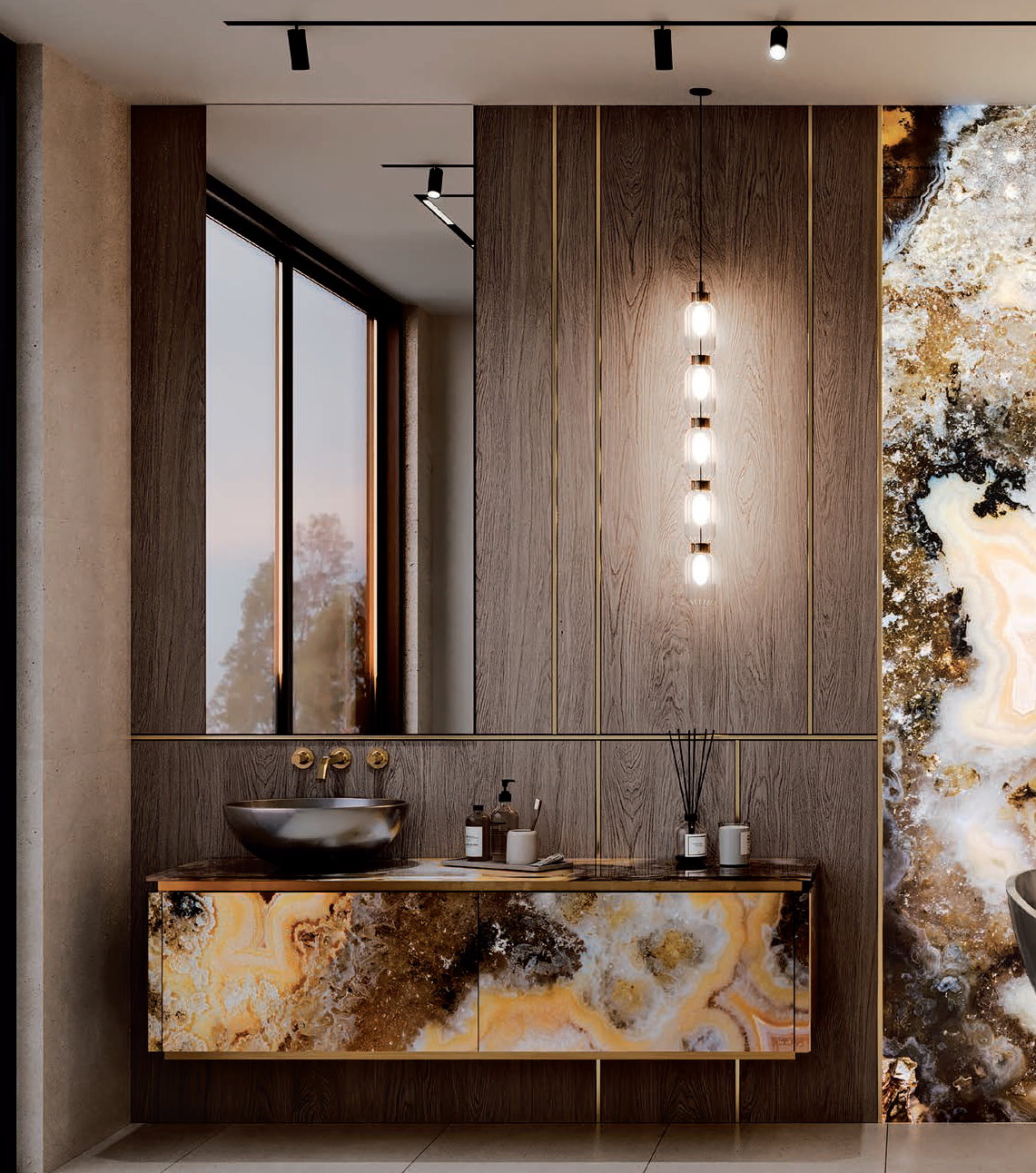 Die Verwendung von Vetrite-Glas, das sich auch für die Hintergrundbeleuchtung eignet, wird mit Metall und matten oder glänzenden Oberflächen in eindrucksvollen Kompositionen kombiniert.