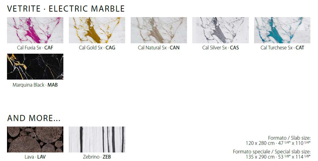 Alle Elemente der Kollektion lassen sich aus Vetrite-Platten fertigen: Gem Glass, Onigem, GemStone, Electric Marble und Sight, jeweils mit den Oberflächenvarianten Solid, Opalescent und Seethrough.