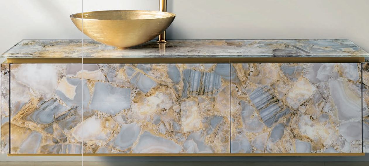 Die Verwendung von Vetrite-Glas, das sich auch für die Hintergrundbeleuchtung eignet, wird mit Metall und matten oder glänzenden Oberflächen in eindrucksvollen Kompositionen kombiniert.