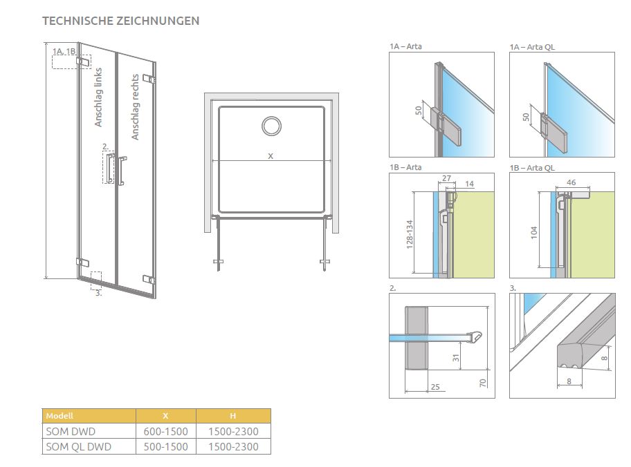 - Tür Arta 8 QL: 500-1500 x 1500-2300 mm - Montage ohne Dichtungsprofil! Scharniere ohne Verstellmöglichkeit, nur bei lotgerechten Wänden einsetzbar
