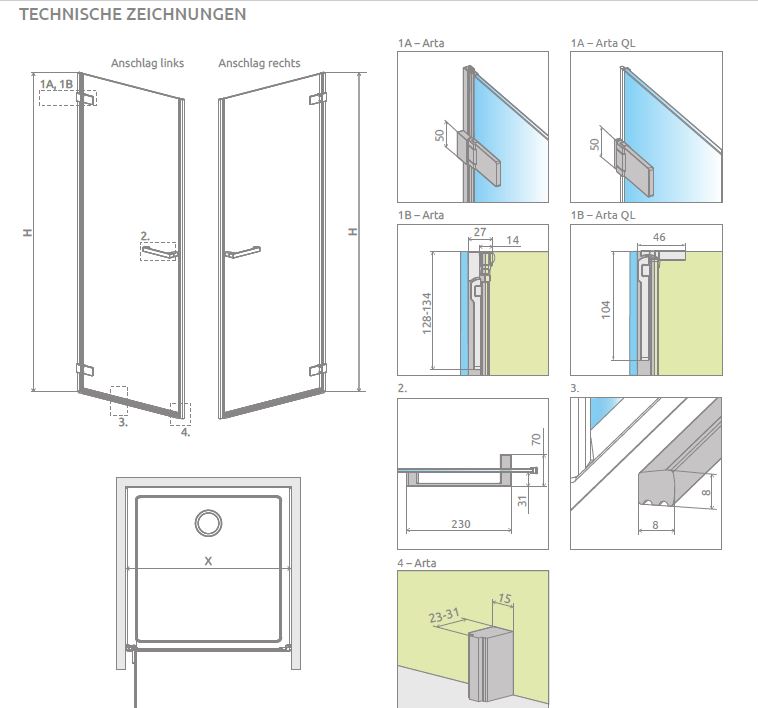 - Tür Arta 8 QL: 500-1000 x 1500-2300 mm - Montage ohne Dichtungsprofil! Scharniere ohne Verstellmöglichkeit, nur bei lotgerechten Wänden einsetzbar