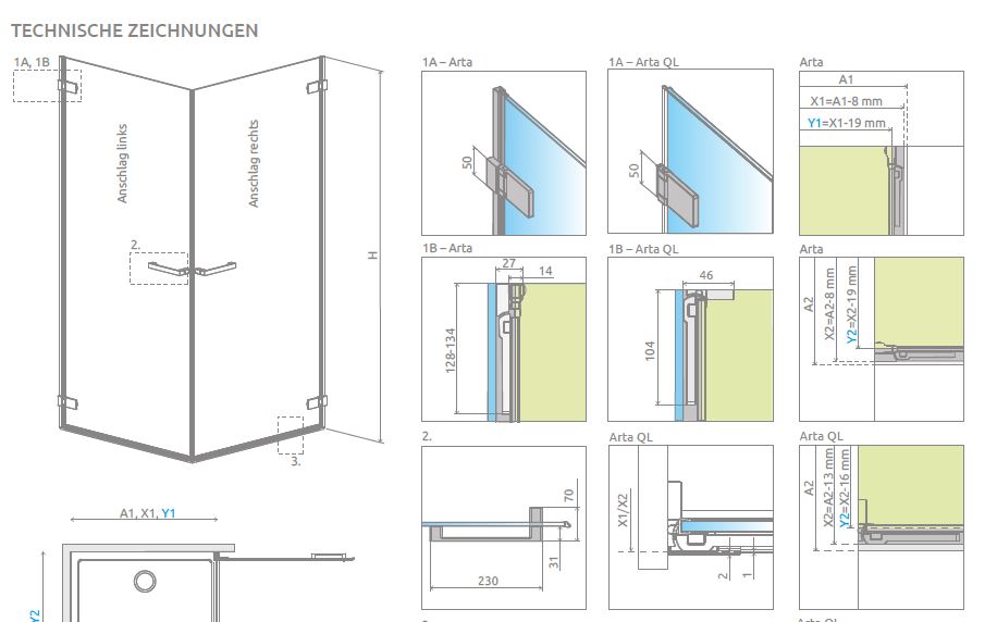 - Tür Arta 8 QL: 500-1025 x 1500-2300 mm - Montage ohne Dichtungsprofil! Scharniere ohne Verstellmöglichkeit, nur bei lotgerechten Wänden einsetzbar