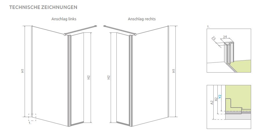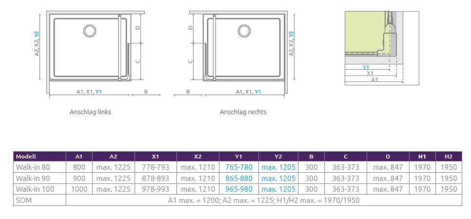 - Breite max. = 1200; Einstieg max. = 1225; Höhe Duschwand und Flügel max. = 1970/1950