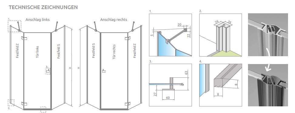 Sollten Ihre Wände außer Lot sein, so ist dies für die Wandanschlussprofile der Serie Essenza kein Problem, da diese spielend leicht ausgeglichen werden können.