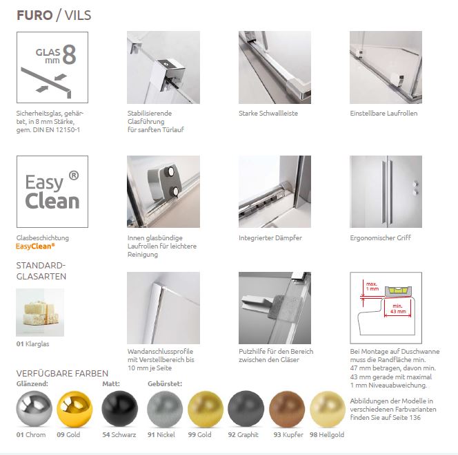Die Serie Furo ist ein wahrer Verwandlungskünstler: Je nach Kundenwunsch kann die Profilfarbe der Duschabtrennung, die Griffe oder die Position der Stabilisatoren gewählt werden.