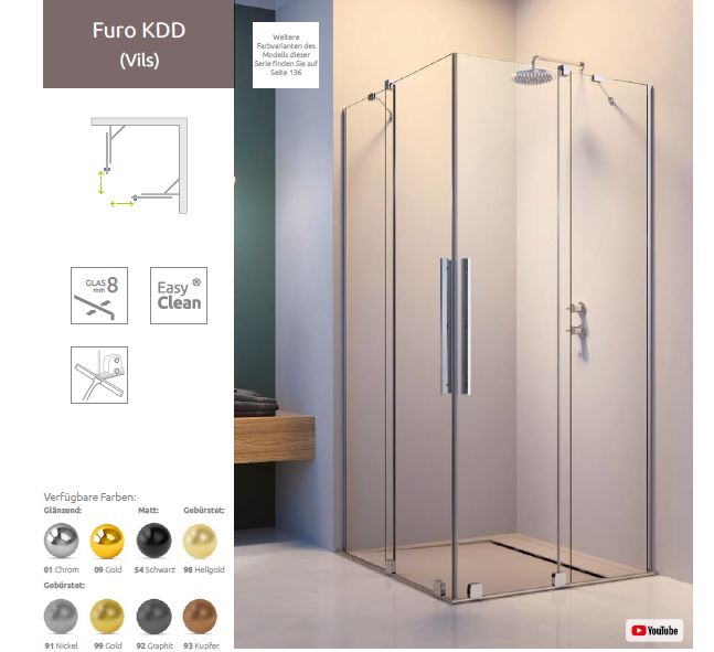 Die Serie Furo ist ein wahrer Verwandlungskünstler: Je nach Kundenwunsch kann die Profilfarbe der Duschabtrennung, die Griffe oder die Position der Stabilisatoren gewählt werden.