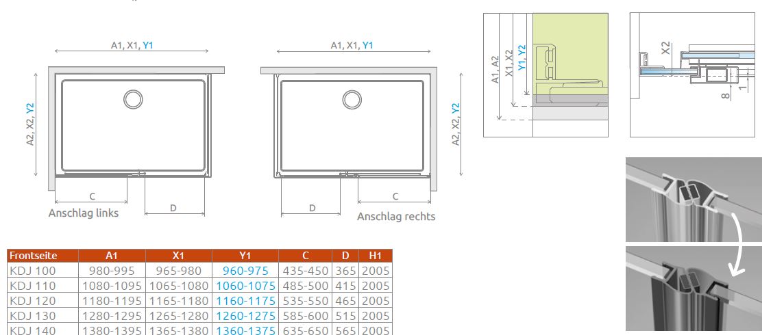 - Gleittür mit Festteil: 1200 / 1400 mm und Sonderanfertigungen