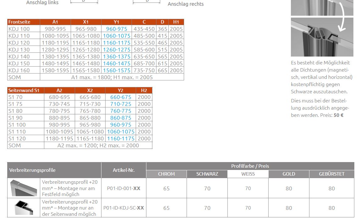 - Seitenteil: 750 / 800 / 900 / 1000 mm und Sonderanfertigungen