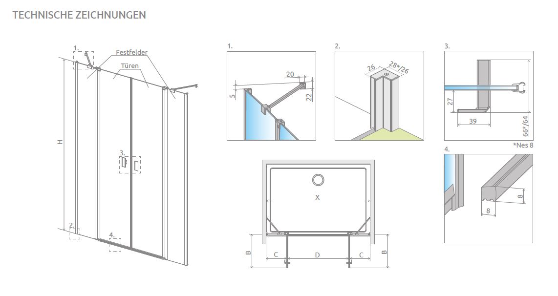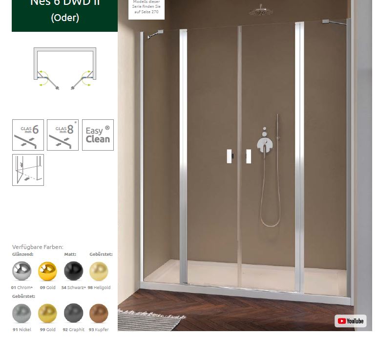 Radaway Nes DWD II Duschtür für Nische Duschabtrennung 2 Pendeltüren mit 2 Festteilen PUK Oder