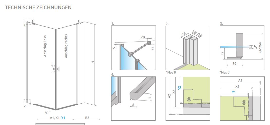 Radaway Nes KDD II Eck-Duschkabine 2 Pendeltüren an 2 Festteilen PUK Oder